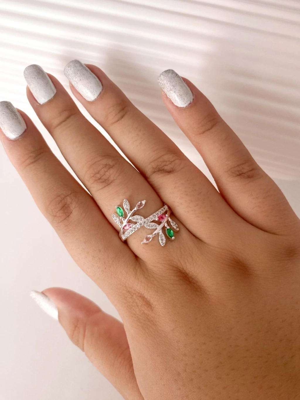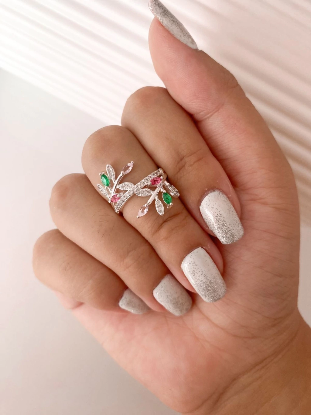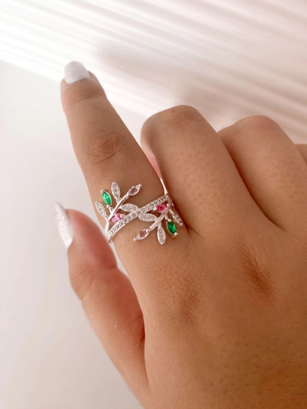 Anel Raminhos Cravejado Rosa e Verde: Elegância com Toque Colorido