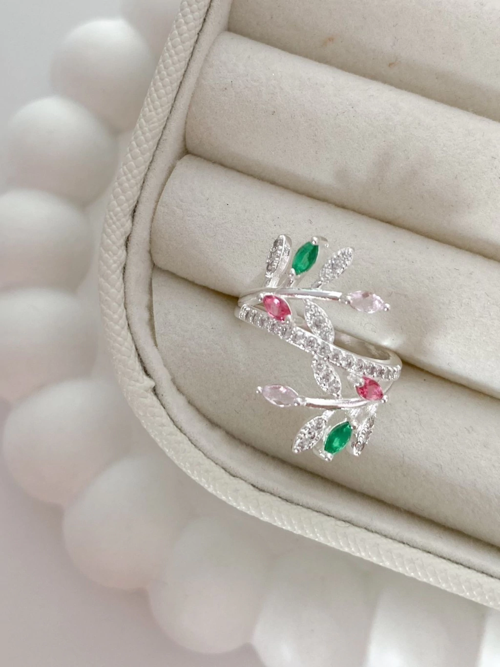 Descubra a beleza única do Anel Raminhos Cravejado Rosa e Verde, uma joia que combina o brilho intenso das zircônias com um design delicado e sofisticado.