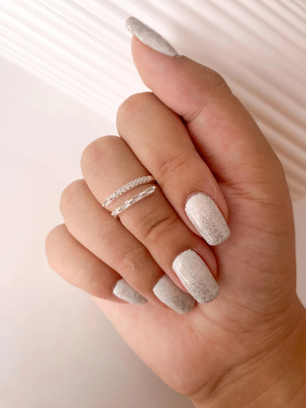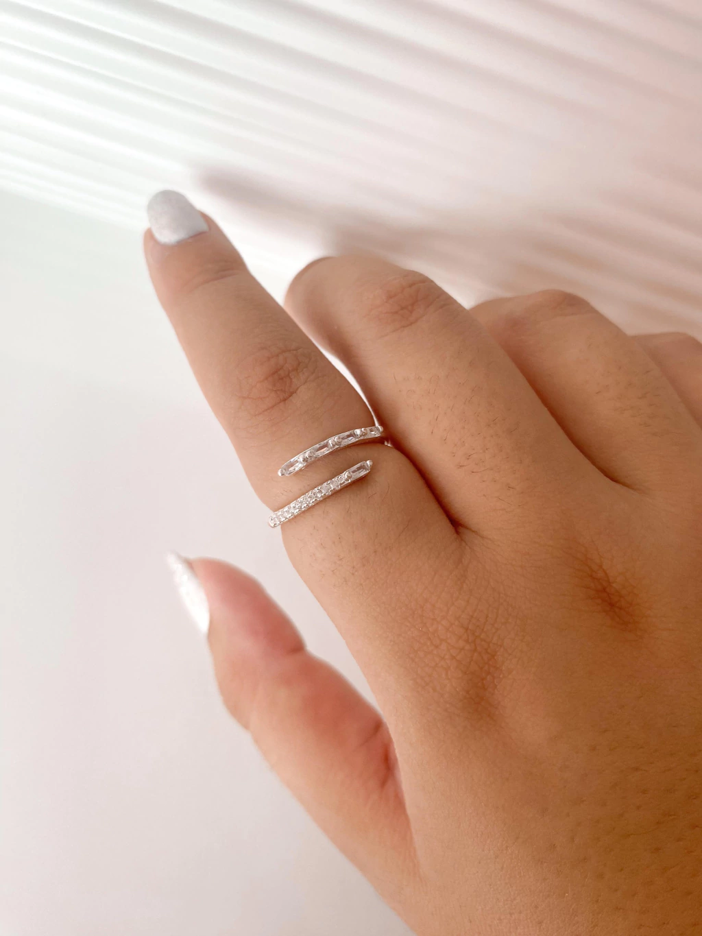Adicione elegância e versatilidade ao seu visual com o Anel Regulável com Zircônia Baguete e Aro Cravejado em Micro Zircônias Cristal.