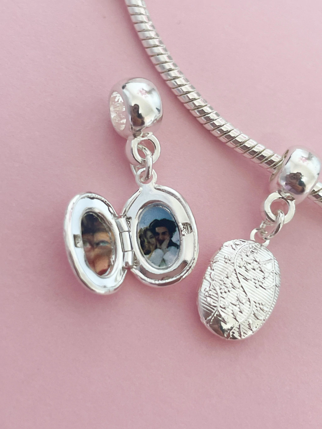 Guarde suas lembranças mais preciosas com o Berloque Relicário Oval Floral, uma semijoia delicada e cheia de significado, banhada em prata de alta qualidade e com detalhes em alto-relevo de raminhos florais que transmitem elegância e afeto.